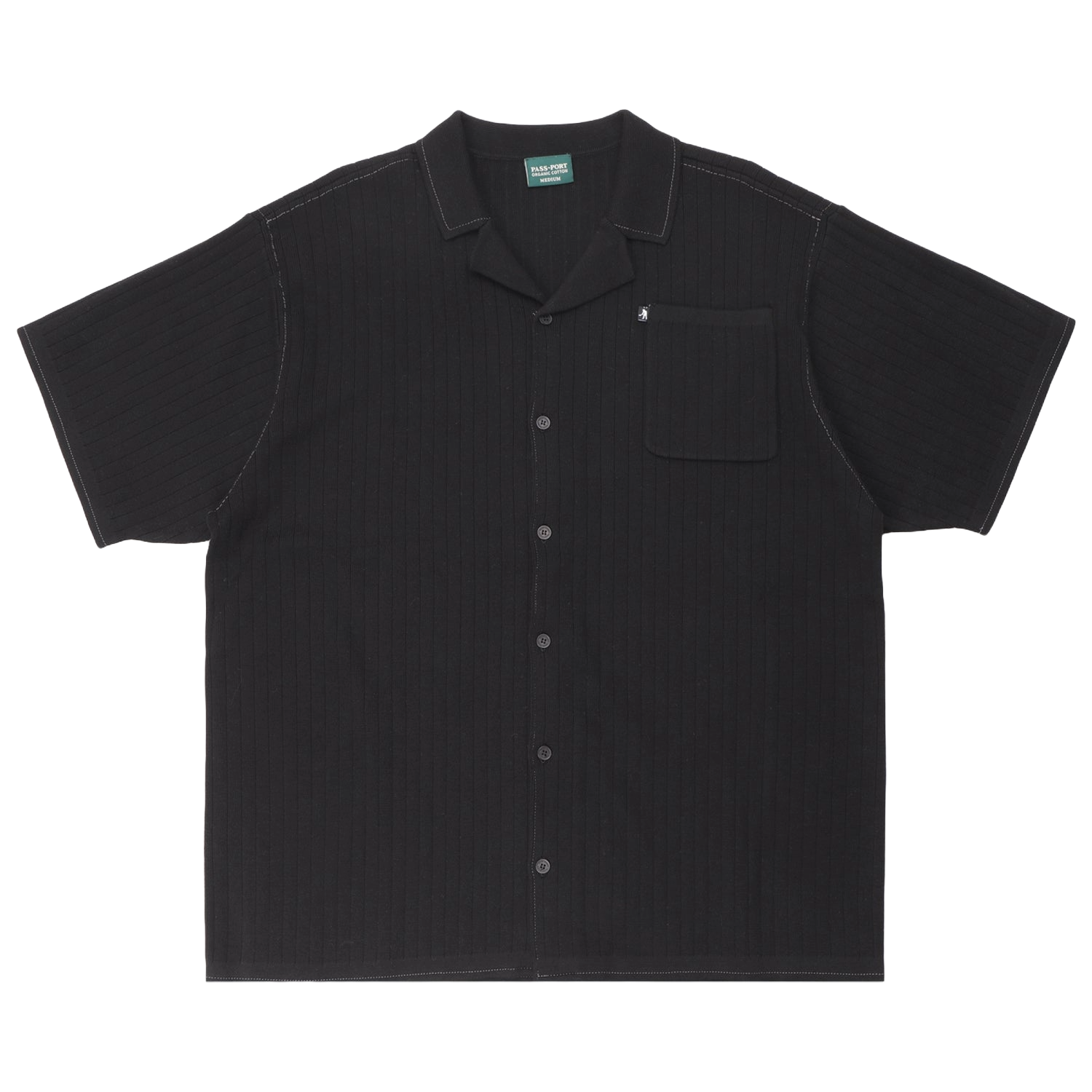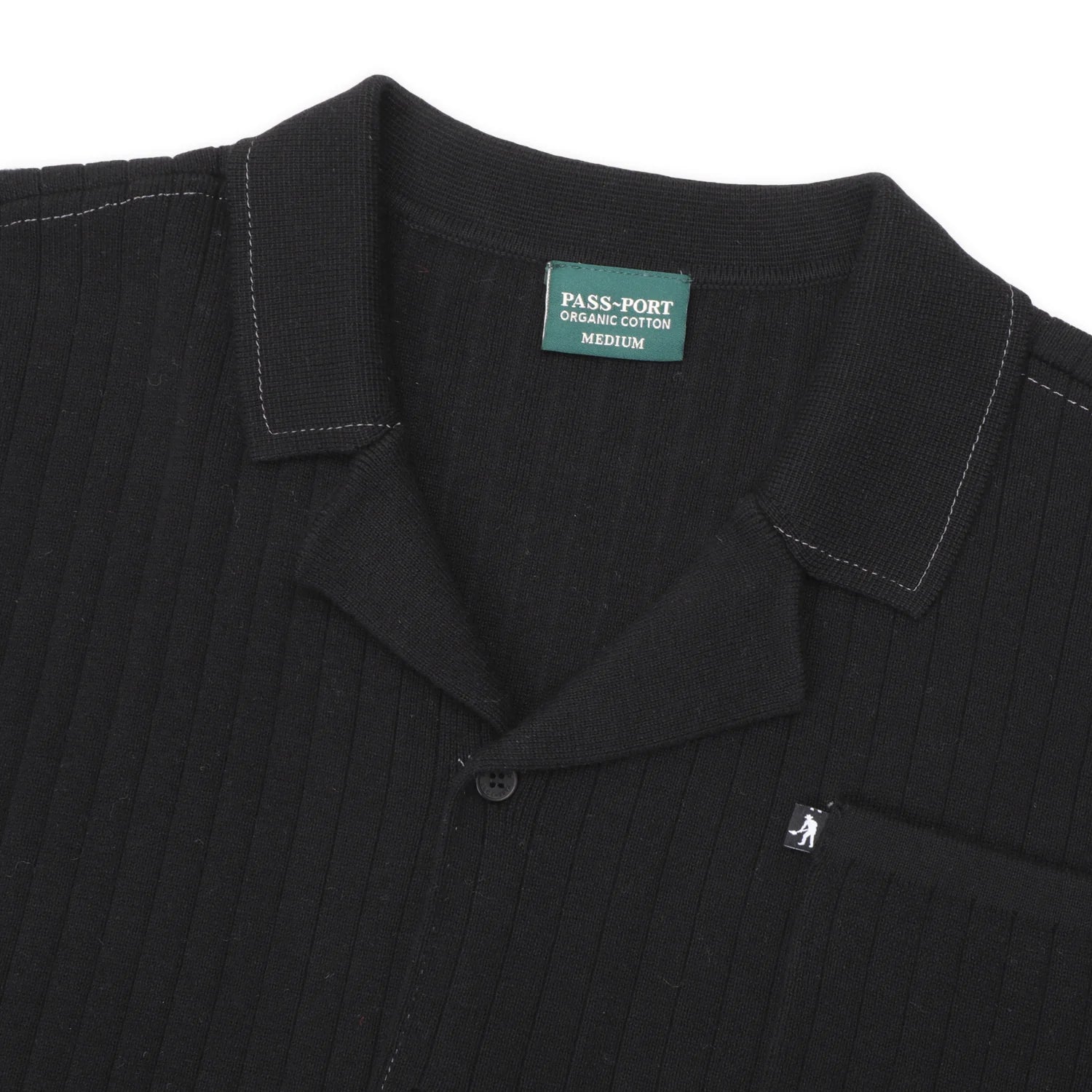 Pass~Port Organic Knit Leagues Shirt in black from range #46. The knitted leagues shirt is made from 100% organic cotton with contrast stitching, recycled buttons and woven pip.